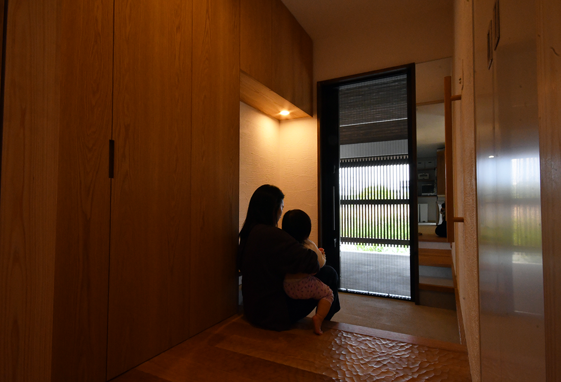 〇 子育て中も老後も便利に、雨に濡れることなく玄関へ入れるガレージ