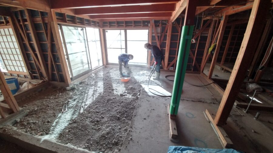 内部の土間コンクリートをはじめ、その下の断熱材や砕石、はたまた床下空間を作る為の土の搬出も完了となりました。