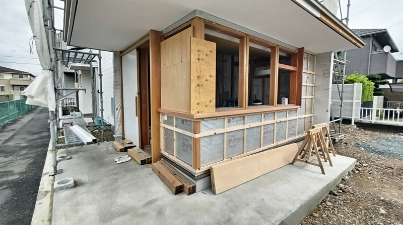 今回は主に建具枠の工事。入口扉や窓は木枠でつくります。
