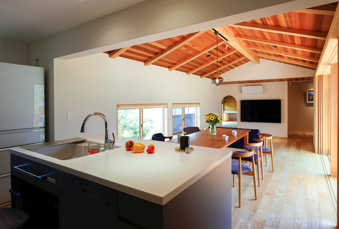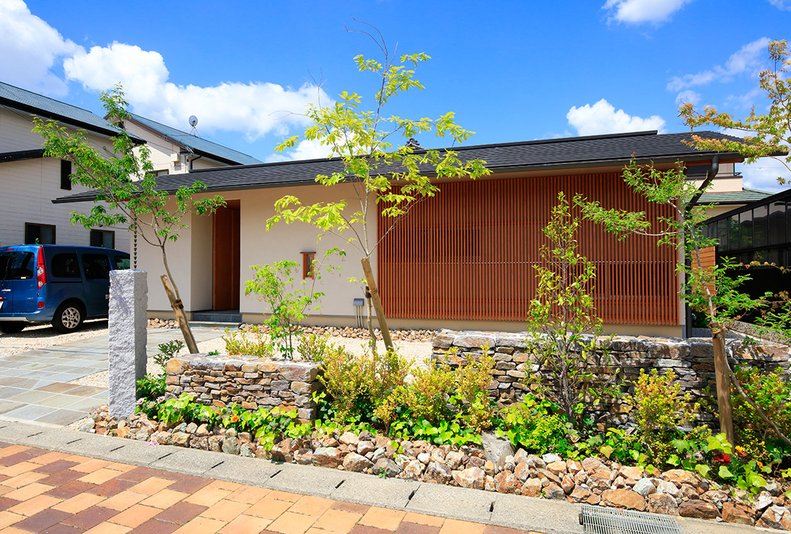 お打合せの時には、新たな仕様の提案もご採用いただき、タイルの貼り方では、発想が実際形となり、ご選定されたものが、段階を経て揃っていく様子の妙、また整っていく彩に、今までにはない、感動を覚えました。整った方形の総二階部分に、切妻の下屋が二方向から繋がる形状が、特徴的で、道路からの視線を遮りつつ、コの字に中庭に開いています。切妻屋根をした深い軒、格子、庭木がご近所の心も和ませます。