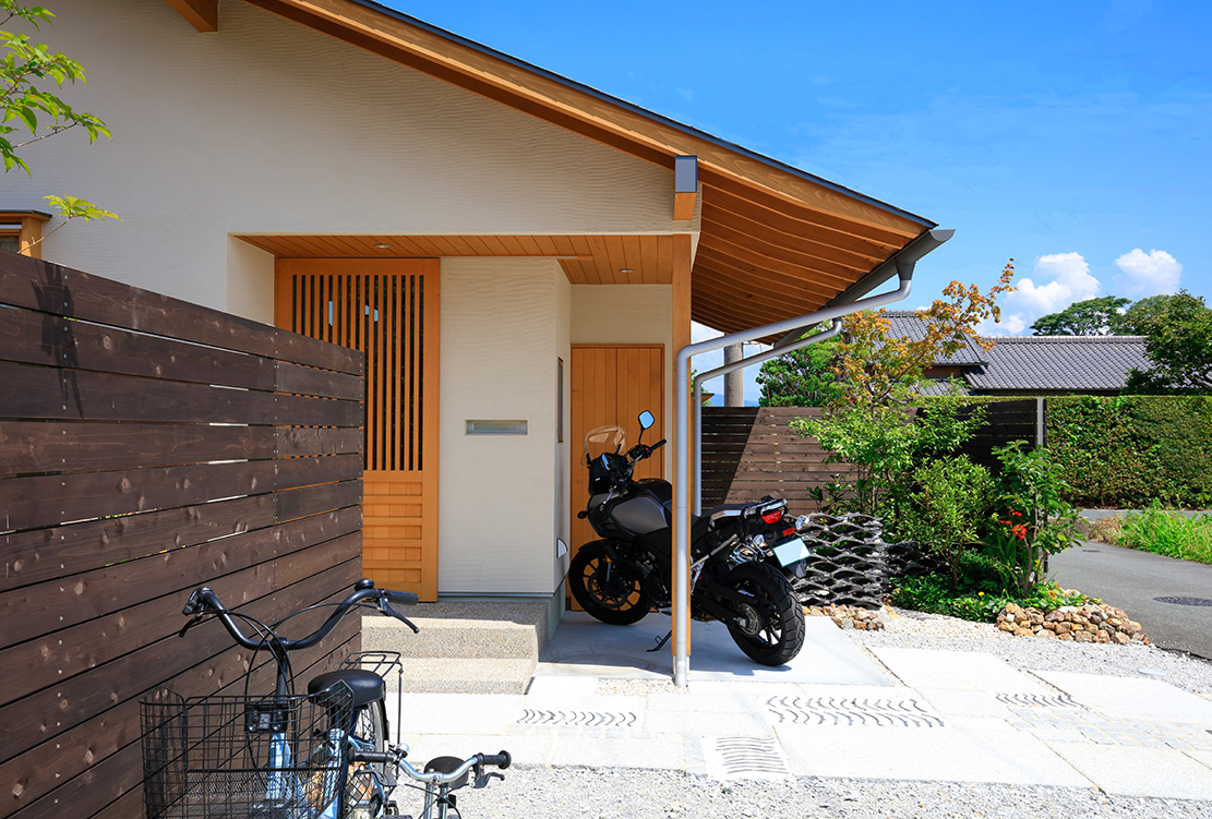 主人のご両親のご実家の建て替えということで、どこかに旧家の雰囲気を残したく、旧家の瓦を再利用したお庭を提案しました。リビングは白い天井に太い梁の木組みが映え、吹き抜けで2階の廊下と繋がっており、どこにいても家族の気配を感じられる空間としています。また、リビングとは対照的に玄関や和室は天井高さを抑え、メリハリのある空間となるように、水廻りは洗う・干す・仕舞うが短距離で行える計画としました。