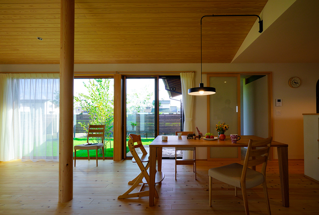 約100坪の土地の東西南北に腕を伸ばすようにT字型の建物を配置し、南側の庭に向けて大きな開口部を設けています。隣地には住宅が無いため、窓を開放して暮らすことができ、視覚的にも庭と一体となる居間になりました。春から秋にかけて心地良い風が流れ込み、風なびく草の音が聞こえてきます。