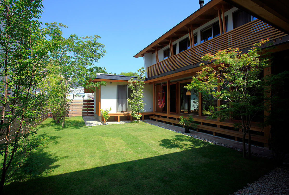 閑静な住宅街の一角に立つ「翡翠の家」。家々が隣接して立ち並ぶ立地を考慮し、外部に対しては閉ざしながらも、内部では、この家の一番の特徴である広々としたリビングの大きな開口から庭の眺めを大胆に取り入れるなど、大らかな開放感を味わえる造りとしました。高さを抑えることで、落ち着いた雰囲気を漂わせつつも、いくつもの切妻屋根を組み合わせた印象的な外観が道行く人の目を引きます。